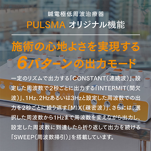 周波数:CONSTANT(連続波) 0.1-100Hz/INTERMIT(間欠波) 3-100Hz/MIX(疎密波) 10-100Hz /SWEEP(周波数掃引) 1-100Hz